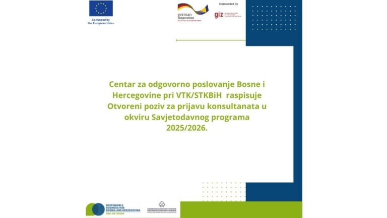 Centar za odgovorno poslovanje BiH pri VTK/STK BiH objavljuje Otvoreni poziv za prijem konsultanata u Bazu konsultanata i učešće u savjetodavnom programu 2025/2026, uključujući petodnevnu obuku o karbonskom otisku u Sarajevu, proces sertifikacije i mogućnost angažmana u pilot projektima s bh. kompanijama. Rok za prijavu je produžen do 29.9.2025.